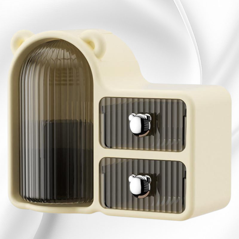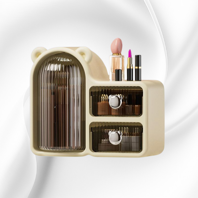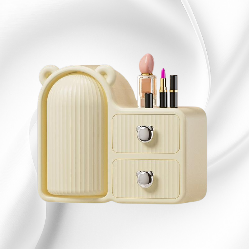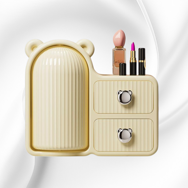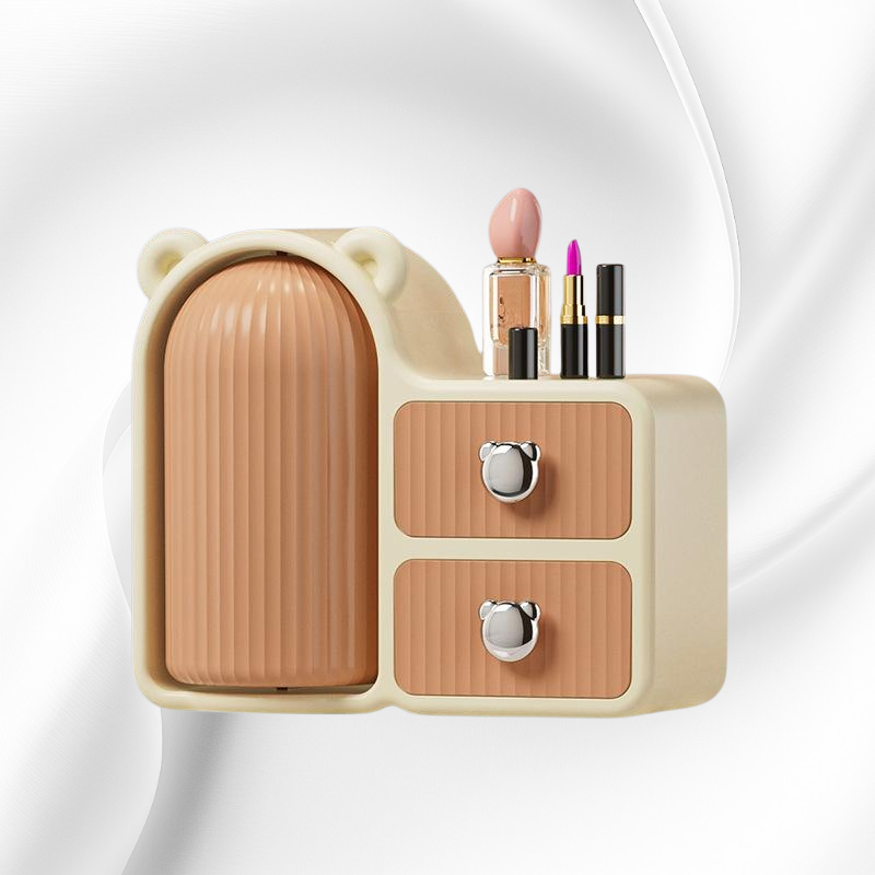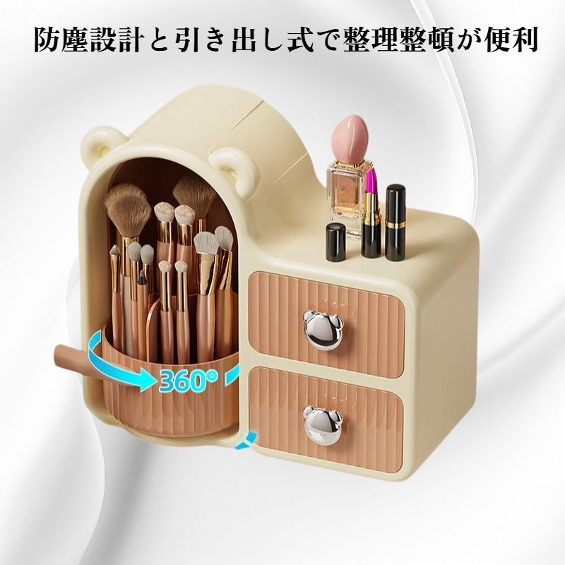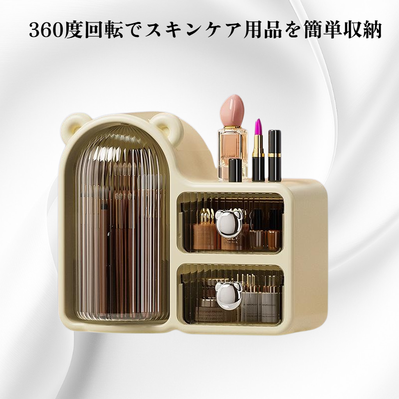 360度回転で取り出し簡単。防塵設計と引き出し付きでコスメやスキンケア用品を清潔に整理収納可能。省スペースでデスク周りもすっきり。